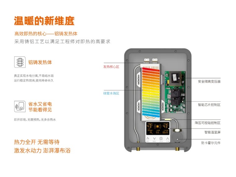 水在高溫和靜止的情況下最容易產生水垢,選用一臺即熱式電熱水器,更快的加熱效率,更少的水垢堆積。輕松攻克傳統儲水式電熱水器幾十年來的痛點,讓每一次水龍頭的開啟,都讓水在機體內“活”力出擊。